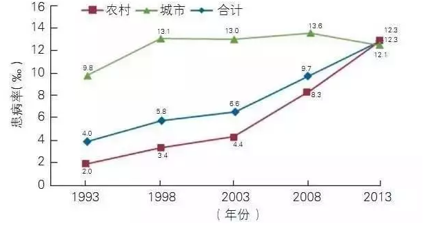 2017年6月,《中國(guó)心血管病報(bào)告2016》發(fā)布,報(bào)告概要刊登于中國(guó)循環(huán)雜志。國(guó)家衛(wèi)生服務(wù)調(diào)查結(jié)果顯示,1993~2013年期間,我國(guó)腦血管病患病率整體呈上升趨勢(shì),以前是城市高于農(nóng)村,但目前已經(jīng)發(fā)生逆轉(zhuǎn)。2013年的第五次調(diào)查顯示,城市腦血管病患病率(12.1‰)有所下降,農(nóng)村(12.3‰)仍呈明顯的上升。腦卒中現(xiàn)患人數(shù)約1300萬(wàn),腦卒中給中國(guó)造成的經(jīng)濟(jì)負(fù)擔(dān)每年高達(dá)400億元。