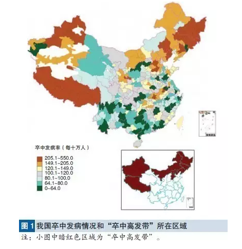 中國(guó)卒中帶 研究顯示,中國(guó)西北部九省市或自治區(qū)(黑龍江、西藏自治區(qū)、吉林、遼寧、新疆維吾爾自治區(qū)、河北、內(nèi)蒙古自治區(qū)、北京及寧夏回族自治區(qū))的卒中發(fā)病率較高,構(gòu)成中國(guó)卒中帶。卒中帶的卒中發(fā)病率為236.2/10萬(wàn),顯著高于卒中帶之外地區(qū)的發(fā)病率109.7/10萬(wàn)。